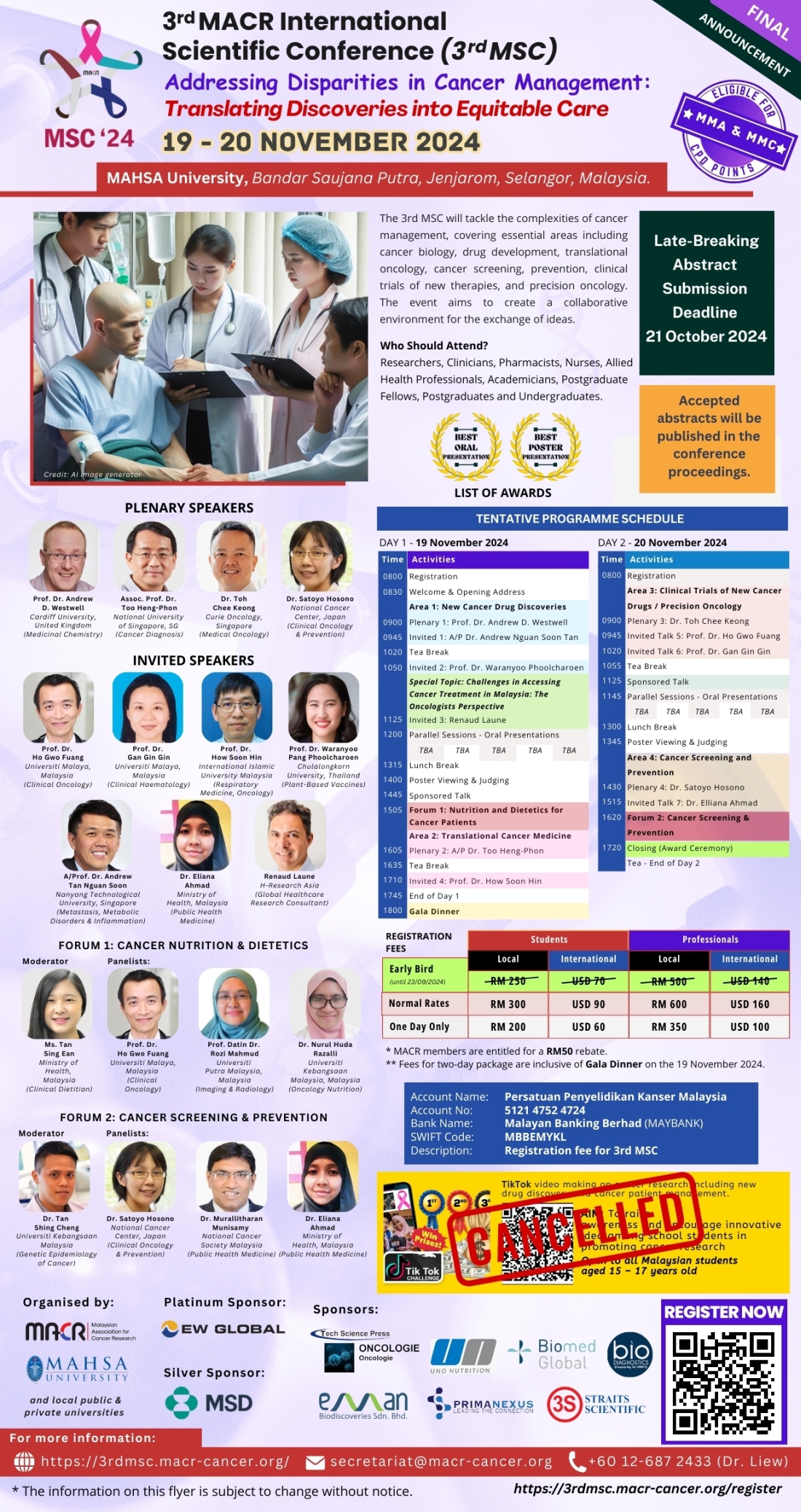 – If you are not able to provide payment proof at time of registration, please email the payment proof to 3rdmsc.finance@macr-cancer.org upon availability.